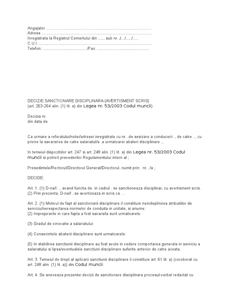 Decizie Sanctionare Disciplinara Avertisment Scris