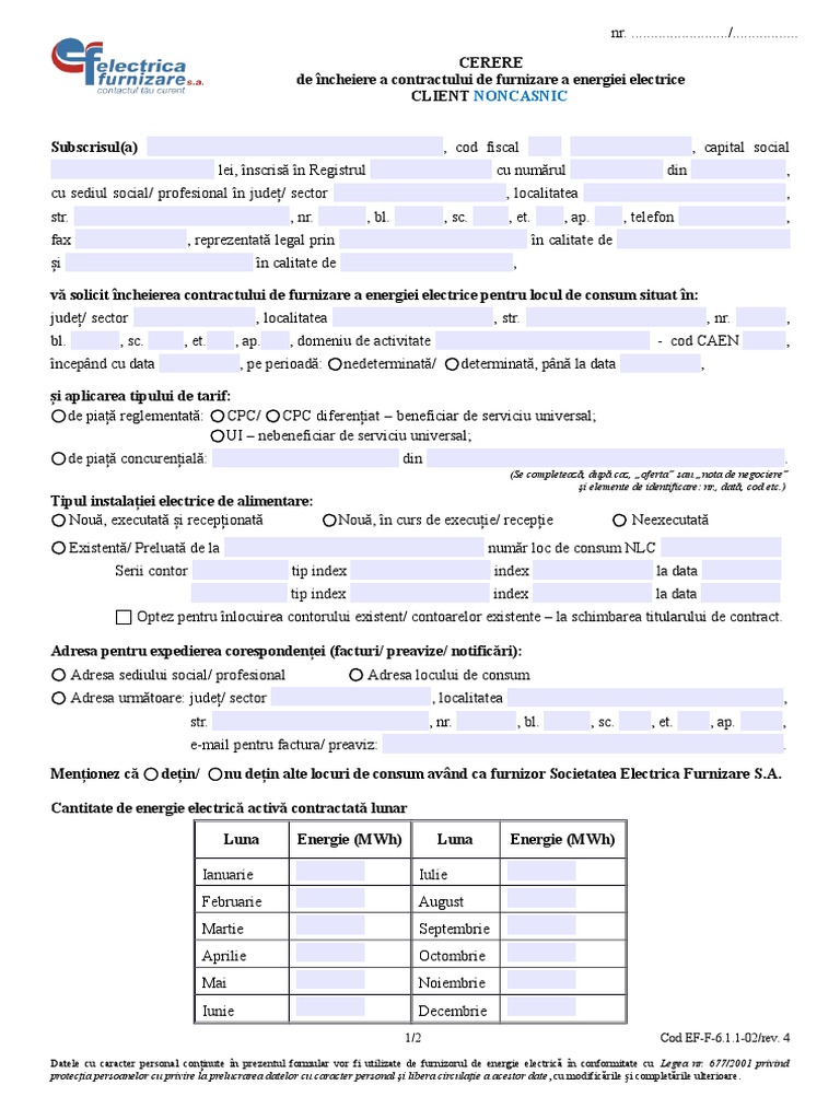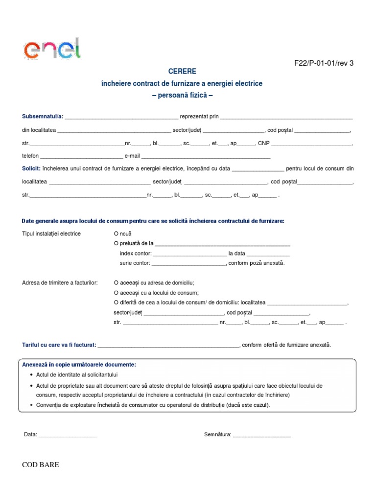 F22 P 01 01 Rev 3 Cerere Intocmire Contract De Furnizare A Energiei Electrice Persoana Fizica