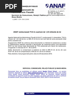 Anaf Ramburseaza Tva In Cuantum De 1 44 Miliarde De Lei A Rpc 1274 28 12 2016