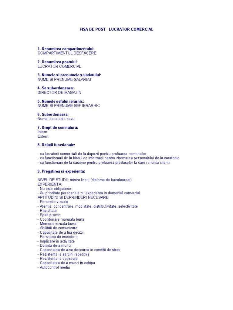 Model Fisa Post Lucrator Comercial Vanzator Doc