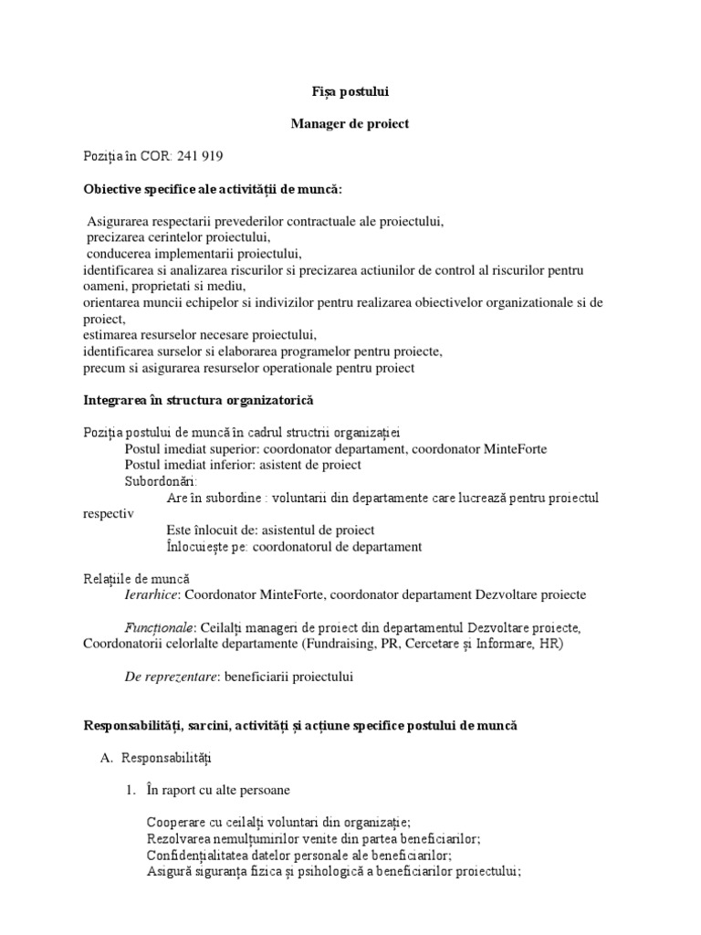 Fisa Postului Pentru Manager Proiect Informatic Pdf Bani Si Afaceri