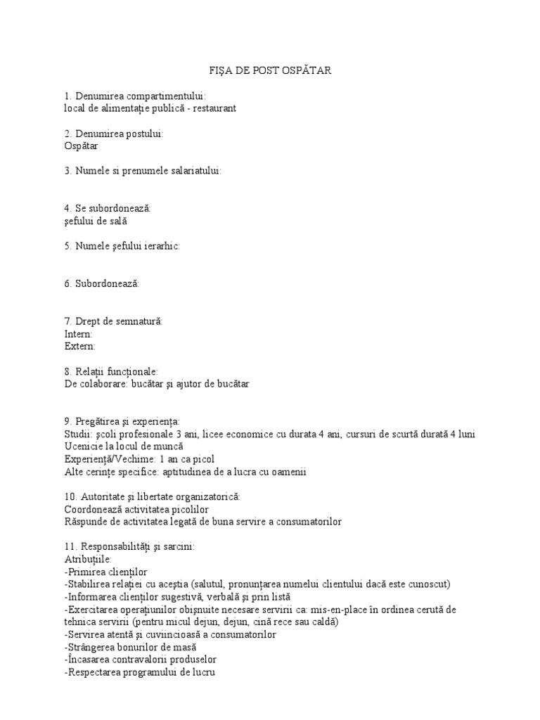 Fisa Postului Barman Ospatar Www Model De Ro