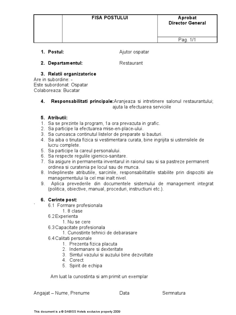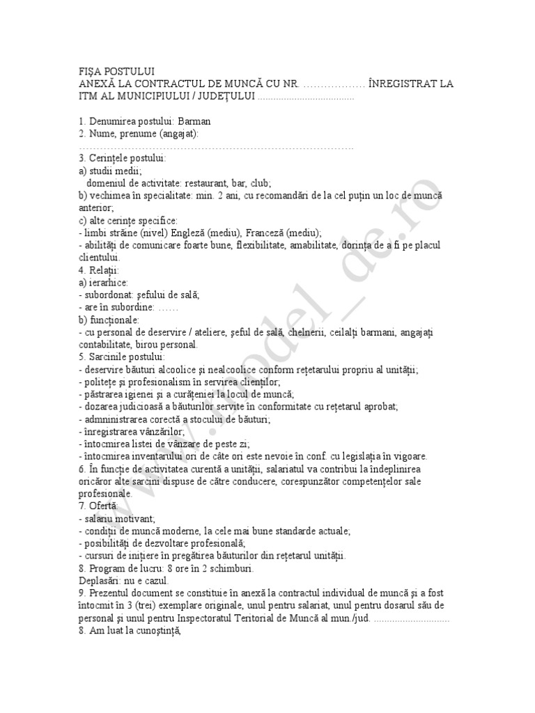 Fisa Postului Barman Ospatar Www Model De Ro Doc Document
