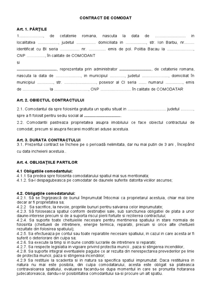 Model Contract De Comodat