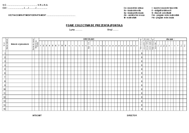 Click aici pentru model fisa pontaj zilnic foaie colectiva de prezenta. Nu conține informații adiționale afișate în pontaj precum. Pentru a descarca modelul de condica pontaj click aici atentie precizare oficiala itm angajații nu au obligația de a semna evidența zilnică a timpului de lucru se poate folosi orice document de evidențiere a orelor de muncă prestate click aici varianta anterioara din august 2017 model pontaj cu program de lucru gratuit și editabil 2 modele în word și. Funcție marcă sau detalii privind contractul individual de muncă pentru toate acestea modelul se regăsește aici.