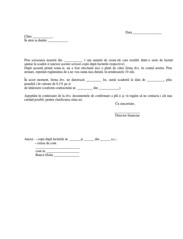 Model scrisoare somatie de plata. Ordonanța de plată rămâne definitivă prin neintroducerea sau respingerea cererii în anulare. Daca veti citi mai departe in articol se spune ca se stabileste un loc de intilnire iar data intilnirii va fi la 15 zile de la primirea de catre debitor a invitatiei. Termenul de plată nu va fi mai mic de 10 zile şi nici nu va depăşi 30 de zile. Vlaicu pîrcălab 27 1 tel.