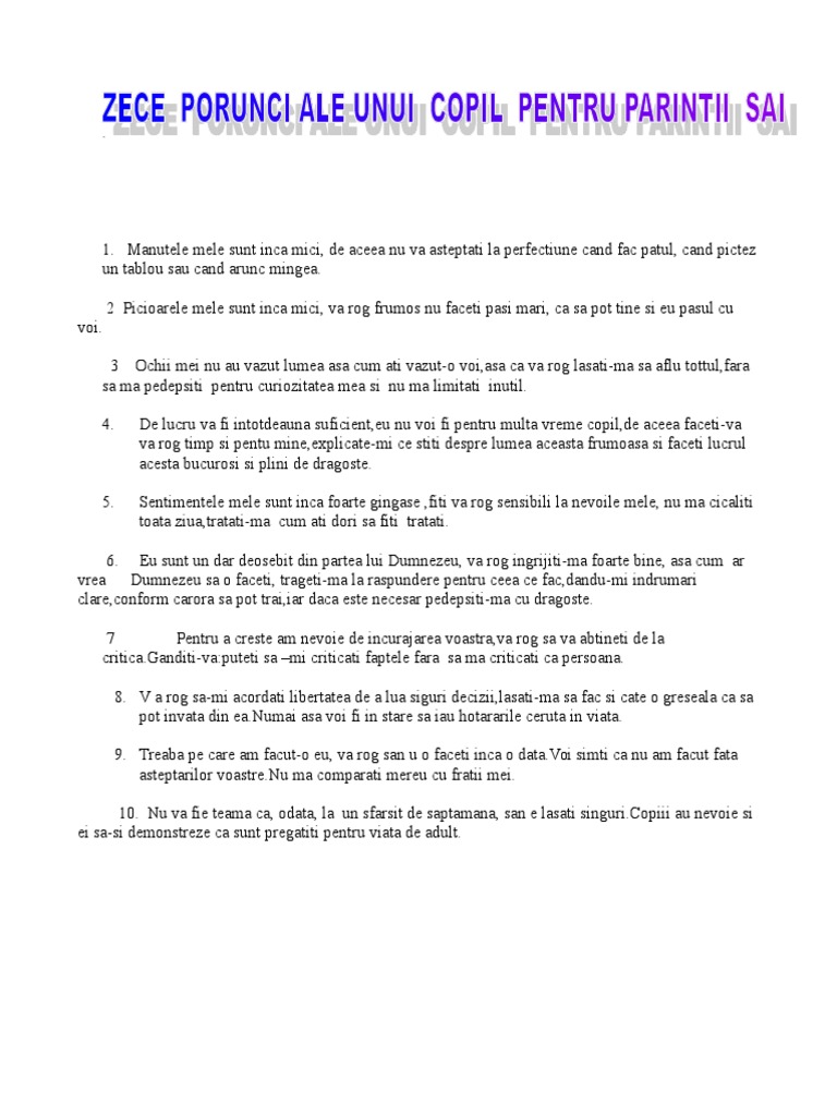 Zece Porunci Ale Unui Copil Pentru Parintii Sai
